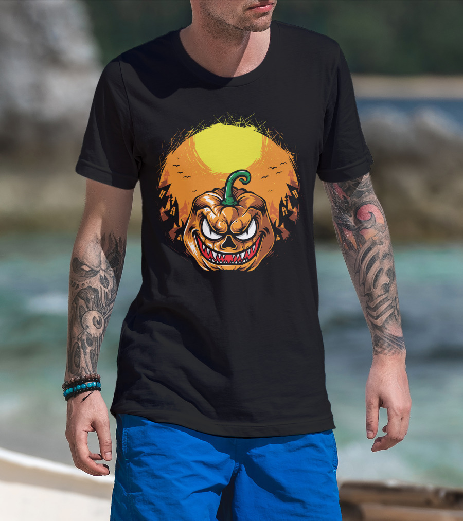 Spooky Grinning Pumpkin With Haunted Houses And Bats Under Full Moon Halloween T-Shirt