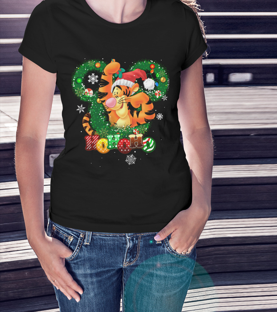 TG HHH Christmas Ho Ho Ho Tigger Santa Hat Snowflakes Holiday Wreath T-Shirt