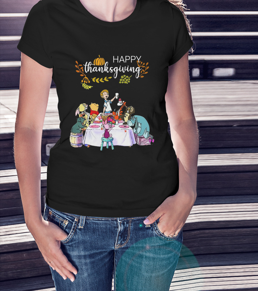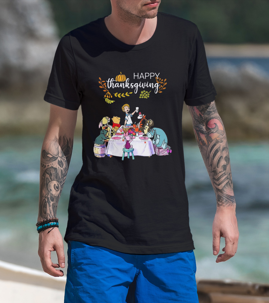 The Winnie The Pooh Happy Thanksgiving Celebration with Friends at Dining Table T-shirt is designed for everyday wear and a consistent fit. Fabric is pre-shrunk ring-spun cotton with durable stitching. See the size chart below for exact measurements.