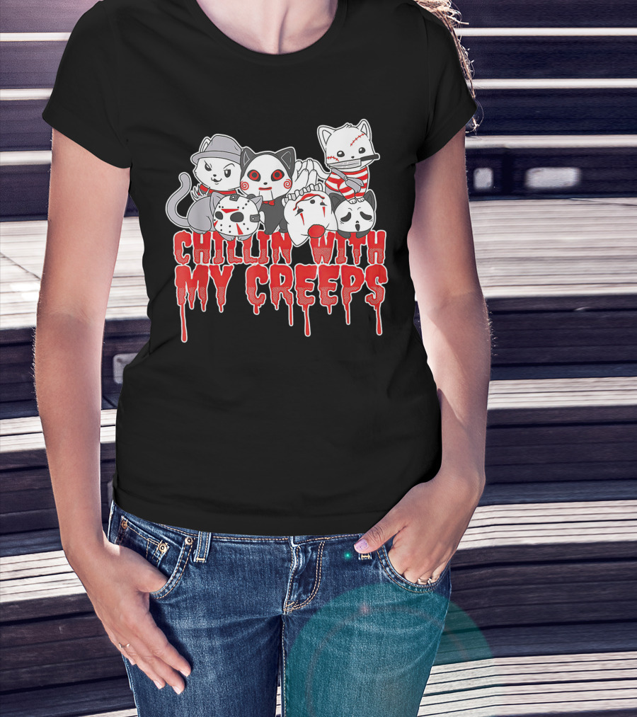 Chillin With My Creeps Halloween Cats In Costumes T-Shirt
