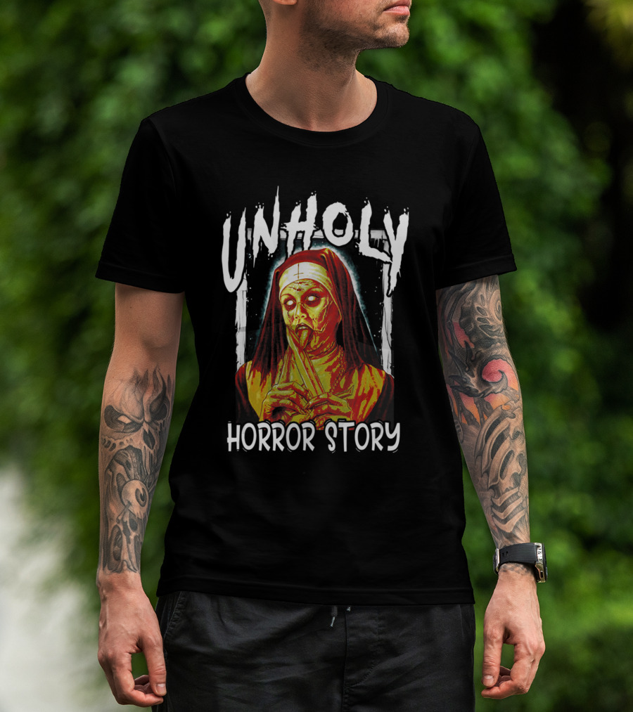 The Unholy Nun Horror Story Zombie Halloween T-shirt is designed for everyday wear and a consistent fit. Fabric is pre-shrunk ring-spun cotton with durable stitching. See the size chart below for exact measurements.