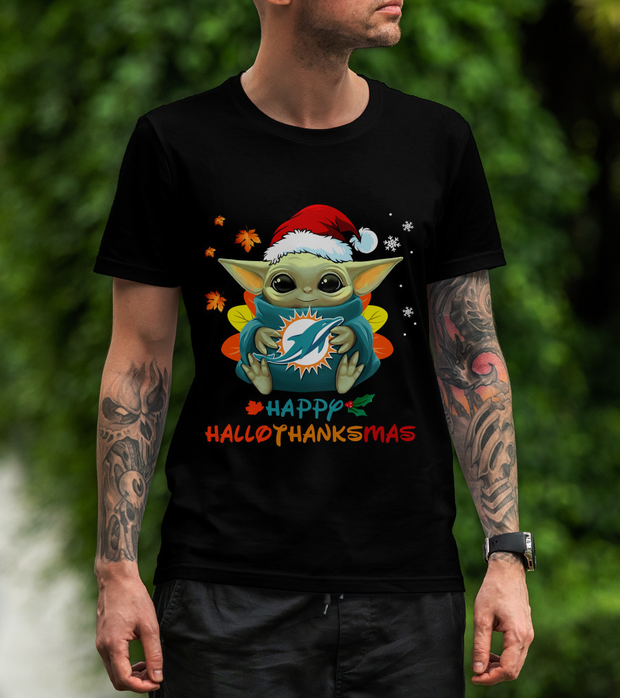 Happy Hallothanksmas Miami Dolphins Baby Yoda T-Shirt