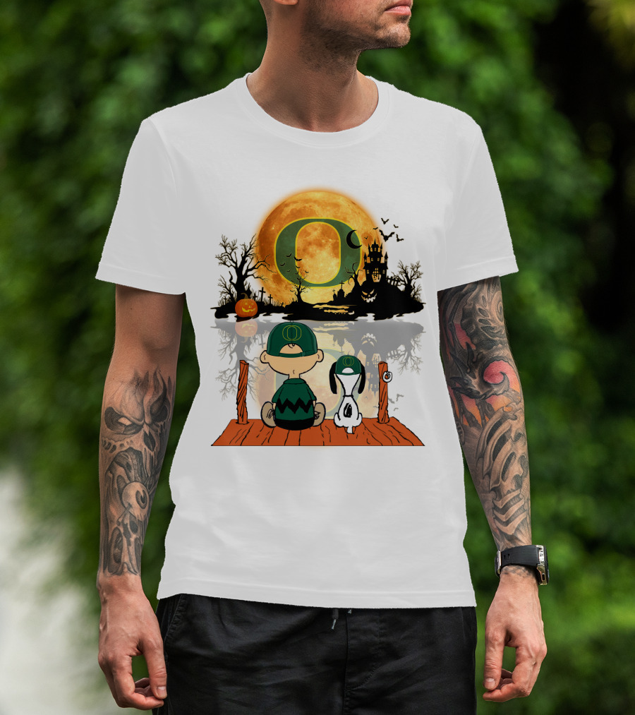 Oregon Ducks Halloween Moon Charlie And Snoopy Reflection T-Shirt