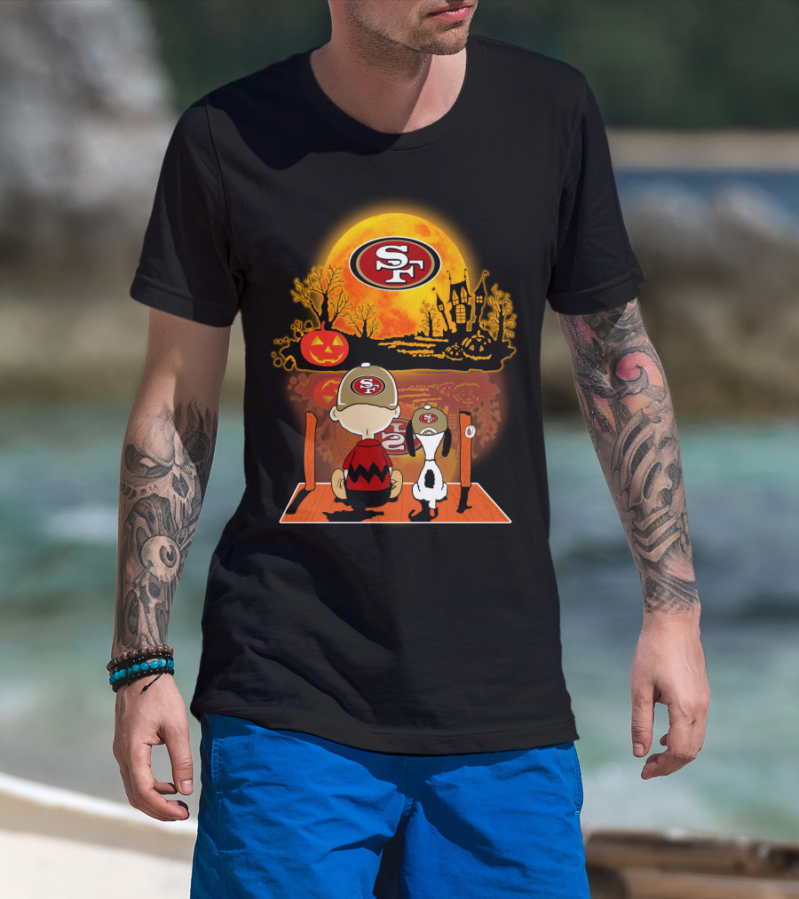 San Francisco 49ers Snoopy Charlie Brown Pumpkin Halloween Moon Scene T-Shirt