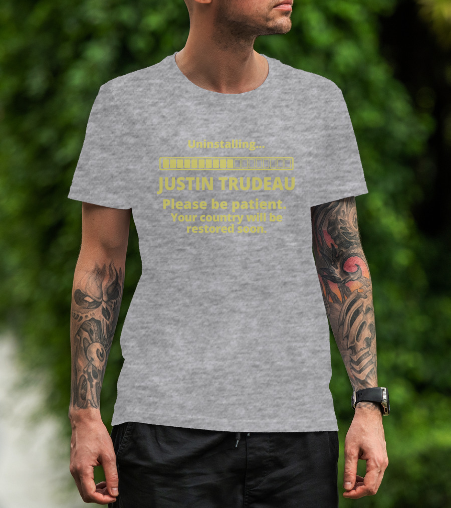 The Uninstalling Justin Trudeau Please Be Patient Your Country Will Be Restored Soon T-shirt is designed for everyday wear and a consistent fit. Fabric is pre-shrunk ring-spun cotton with durable stitching. See the size chart below for exact measurements.