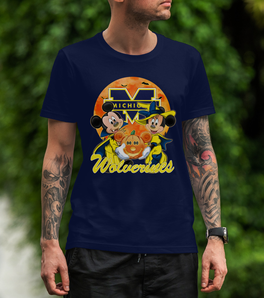 Michigan Wolverines Mickey And Minnie Mouse Halloween Pumpkin T-Shirt