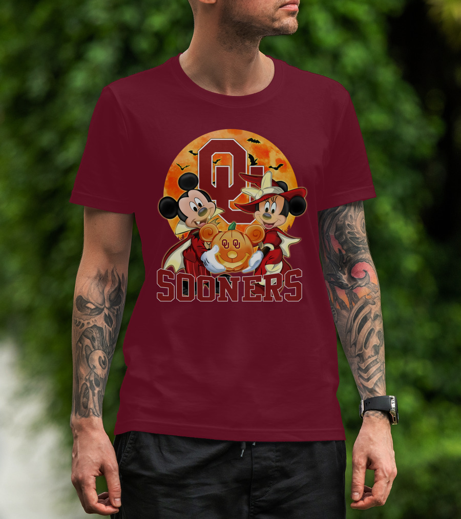 Oklahoma Sooners Mickey Mouse And Minnie Mouse Halloween Pumpkin Moon Bats T-Shirt