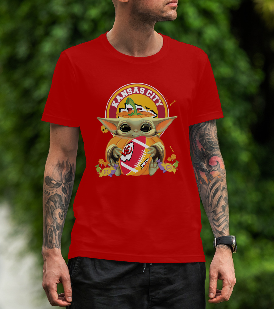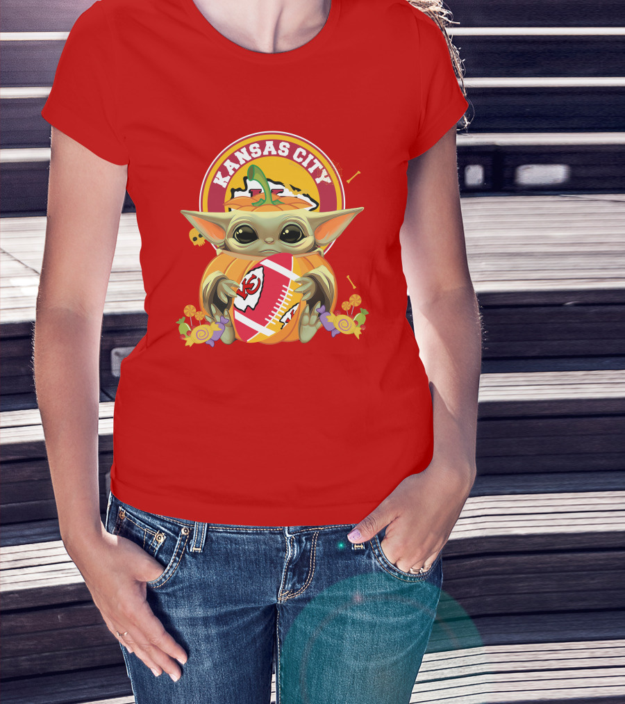 Halloween Pumpkin Baby Yoda Kansas City Chiefs Football Hug T-Shirt
