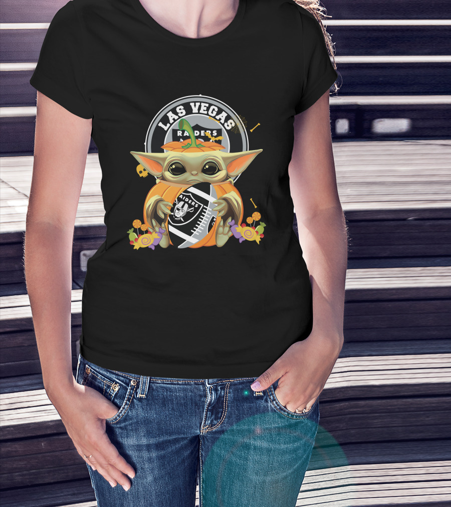 Halloween Pumpkin Baby Yoda Holding Las Vegas Raiders Football T-Shirt