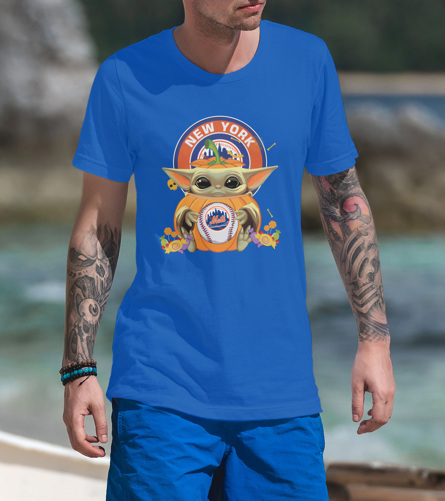 Halloween Pumpkin Baby Yoda Holding New York Mets Baseball With City Skyline T-Shirt