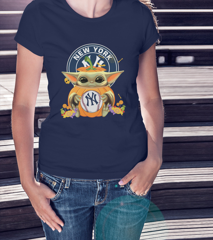 Halloween Pumpkin Baby Yoda Holding New York Yankees Baseball T-Shirt