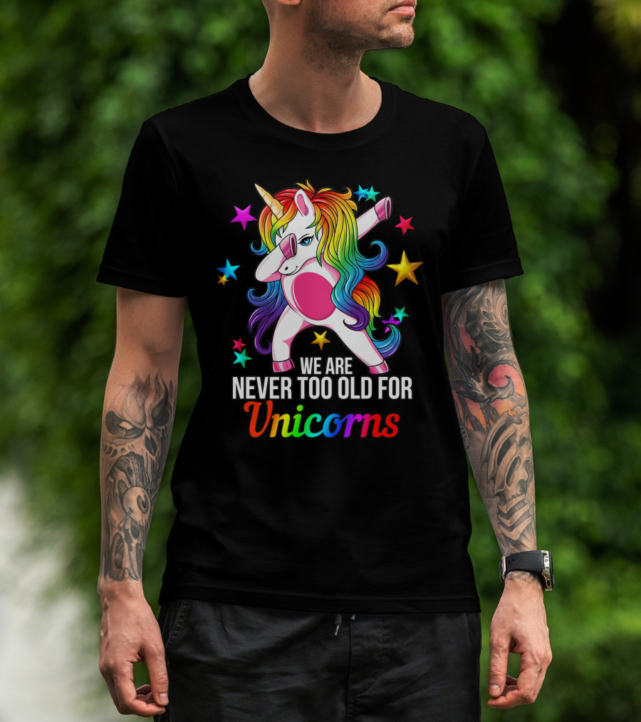 We Are Never Too Old For Unicorns Rainbow Dabbing Stars T-Shirt