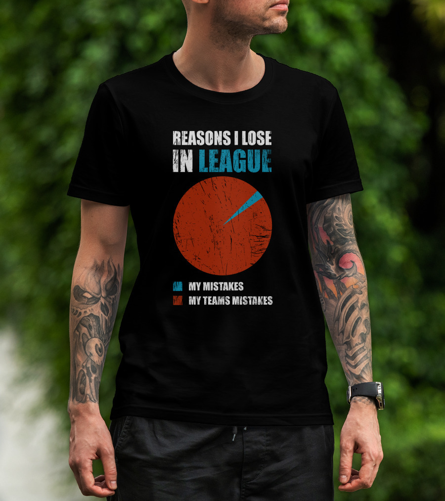 The Reasons I Lose in League My Mistakes My Teams Mistakes T-shirt is designed for everyday wear and a consistent fit. Fabric is pre-shrunk ring-spun cotton with durable stitching. See the size chart below for exact measurements.