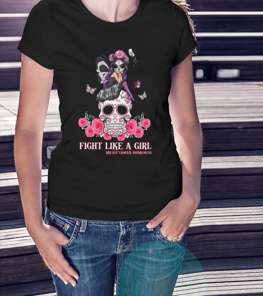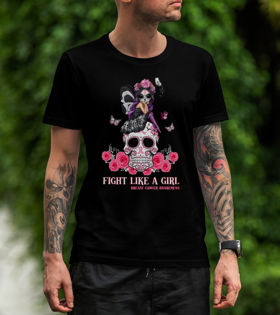 Fight Like A Girl Breast Cancer Awareness Butterfly Skull Roses T-Shirt