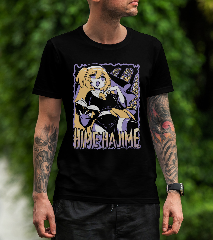 The Hime Hajime Vtuber Halloween Nun Cross Book Stained Glass T-shirt is designed for everyday wear and a consistent fit. Fabric is pre-shrunk ring-spun cotton with durable stitching. See the size chart below for exact measurements.