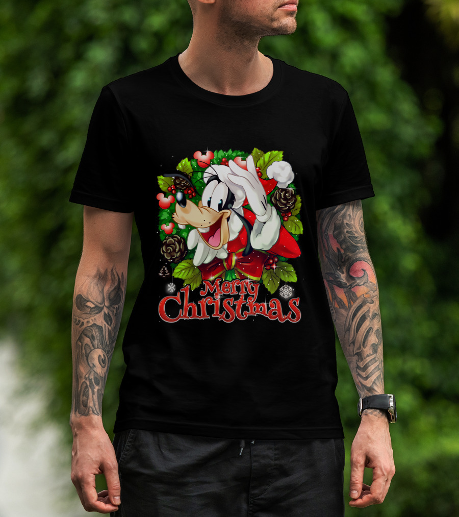 Goofy Merry Christmas Wreath Santa Hat Pinecones Snowflakes And Holly T-Shirt