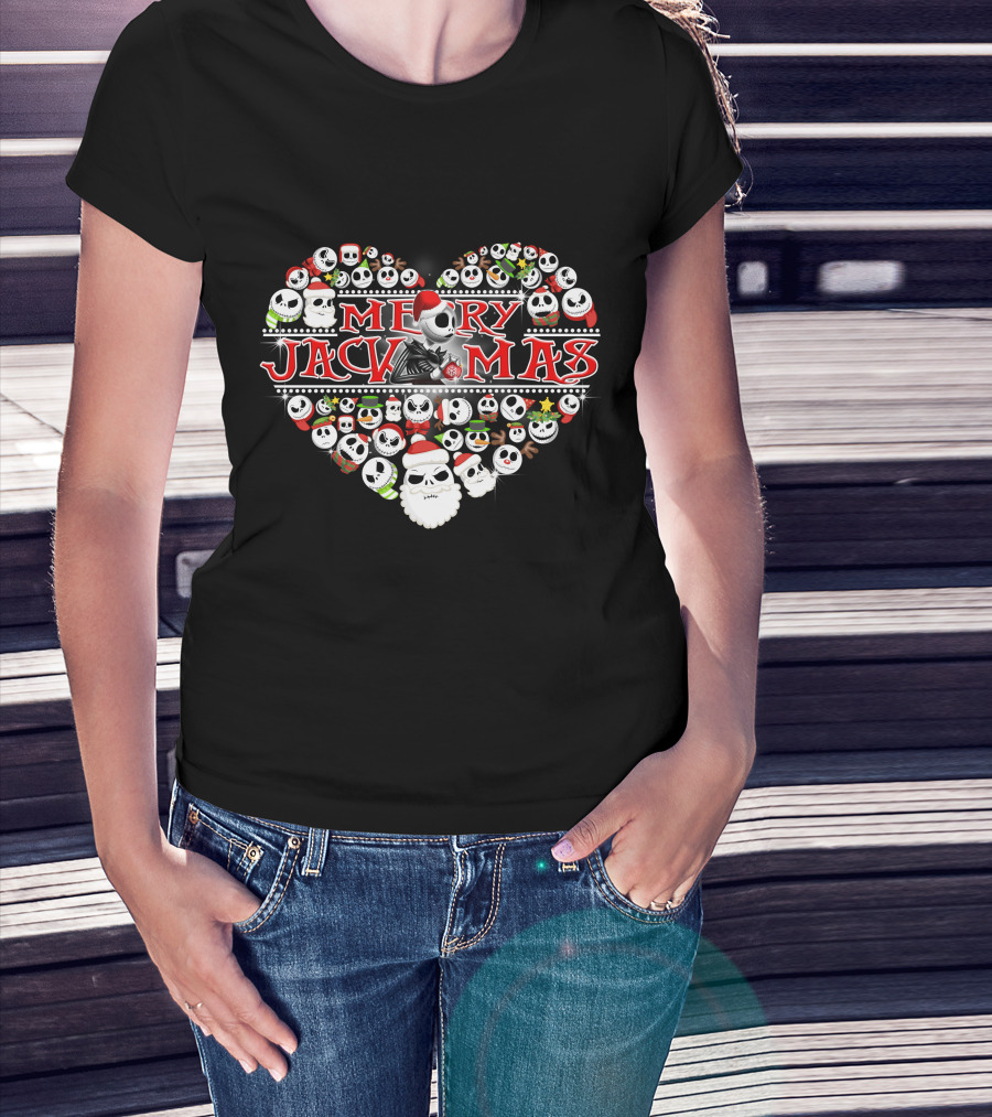 Merry Jackmas Heart Design With Santa Hats And Skulls T-Shirt