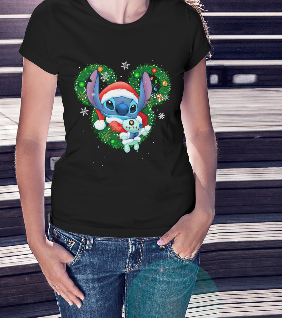 Stitch Christmas Santa Hat Holiday Wreath Snowflakes T-Shirt