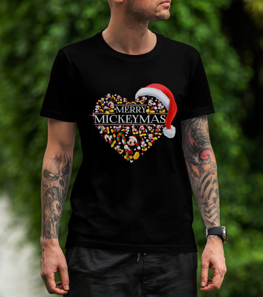Merry Mickeymas Christmas Heart With Santa Hat And Mickey Characters T-Shirt