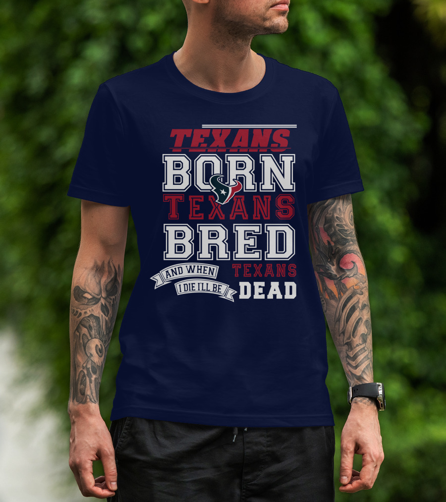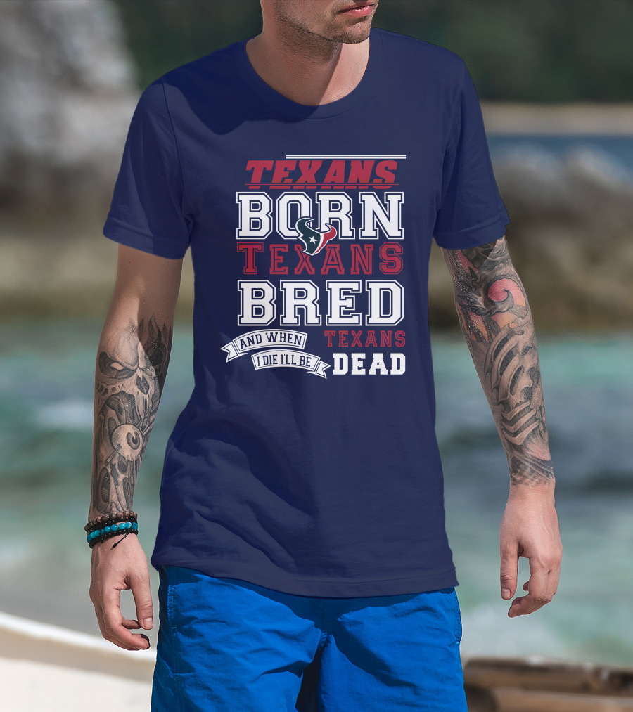 The Texans Born Texans Bred And When I Die I'll Be Texans Dead T-shirt is designed for everyday wear and a consistent fit. Fabric is pre-shrunk ring-spun cotton with durable stitching. See the size chart below for exact measurements.