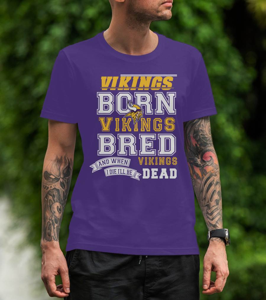 The Vikings Born Vikings Bred And When I Die I'll Be Vikings Dead T-shirt is designed for everyday wear and a consistent fit. Fabric is pre-shrunk ring-spun cotton with durable stitching. See the size chart below for exact measurements.