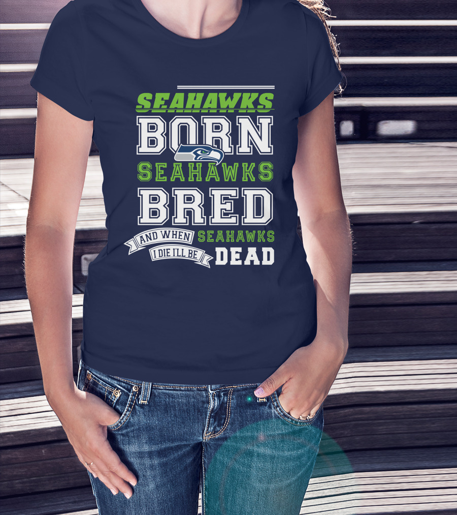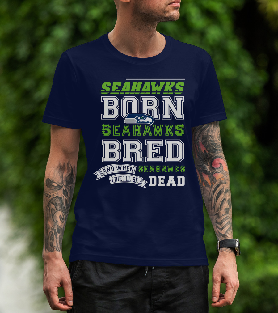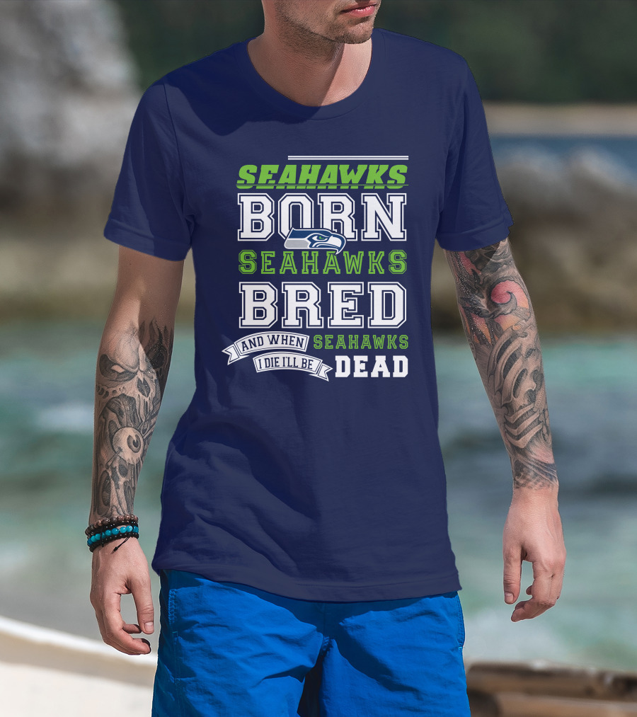 The Seattle Seahawks Born Bred And When I Die I'll Be Dead T-shirt is designed for everyday wear and a consistent fit. Fabric is pre-shrunk ring-spun cotton with durable stitching. See the size chart below for exact measurements.