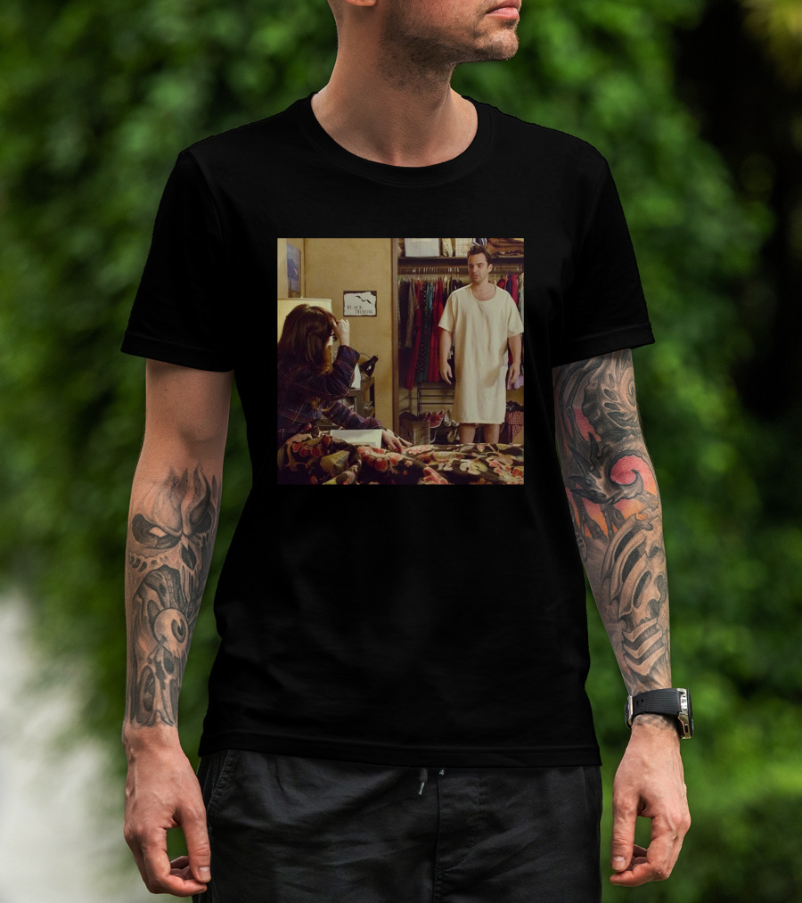 The Nick Miller Sleepwear Scene with Pajamas and Wardrobe T-shirt is designed for everyday wear and a consistent fit. Fabric is pre-shrunk ring-spun cotton with durable stitching. See the size chart below for exact measurements.