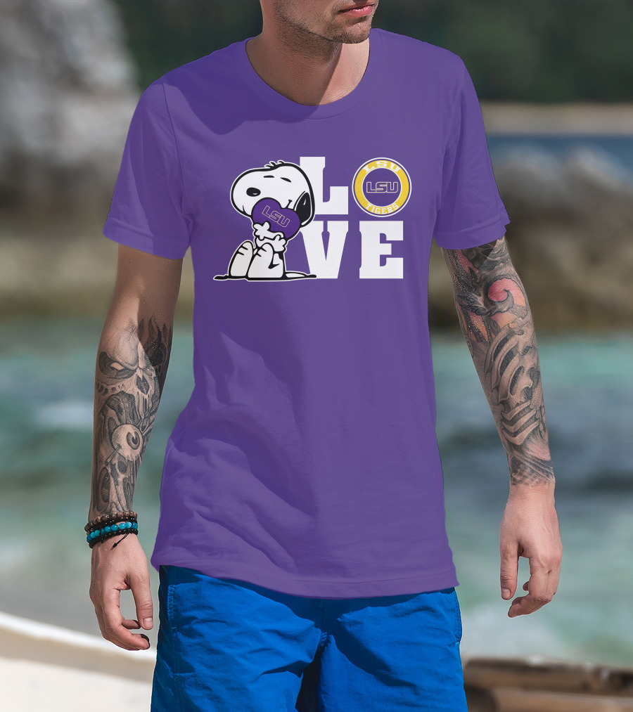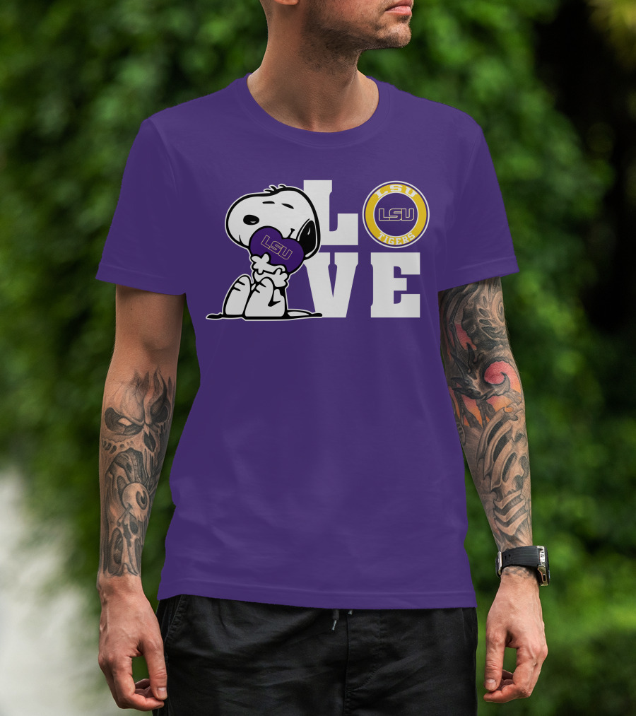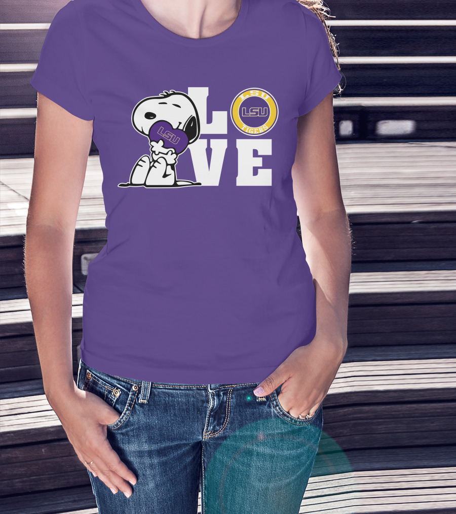 The Snoopy Love LSU Tigers LSU T-shirt is designed for everyday wear and a consistent fit. Fabric is pre-shrunk ring-spun cotton with durable stitching. See the size chart below for exact measurements.