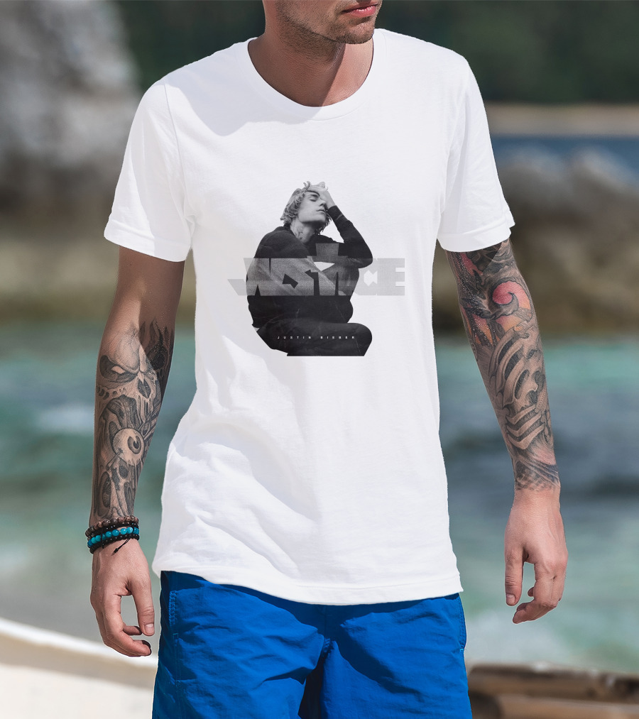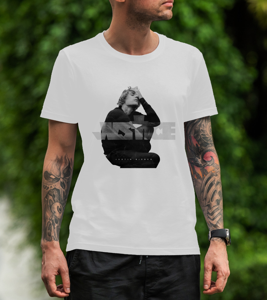 The Justin Bieber Justice Album Cover Black and White Image T-shirt is designed for everyday wear and a consistent fit. Fabric is pre-shrunk ring-spun cotton with durable stitching. See the size chart below for exact measurements.