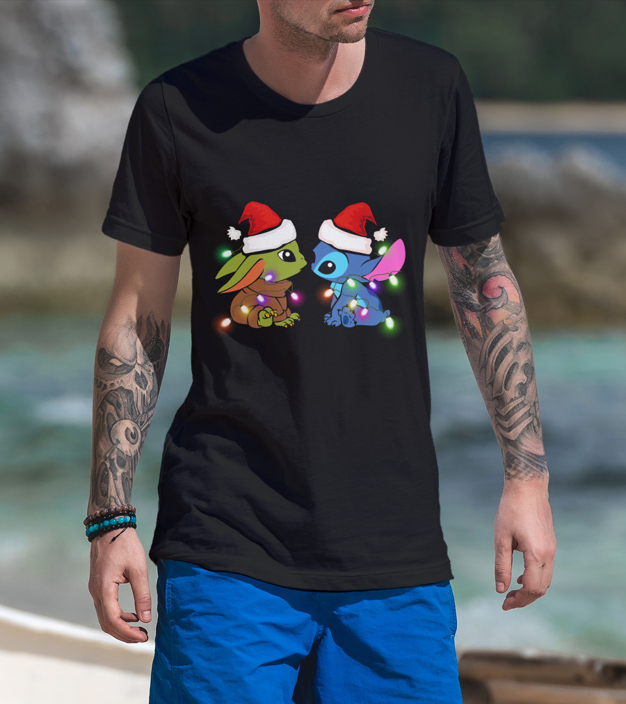 Santa Hat Baby Yoda And Stitch Christmas Lights T-Shirt
