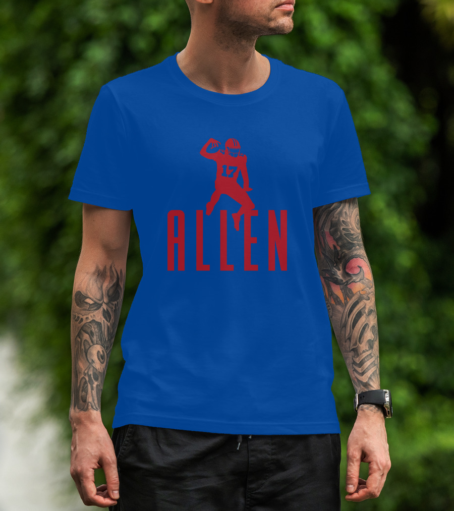 The Buffalo Bills Allen 17 Football T-shirt is designed for everyday wear and a consistent fit. Fabric is pre-shrunk ring-spun cotton with durable stitching. See the size chart below for exact measurements.