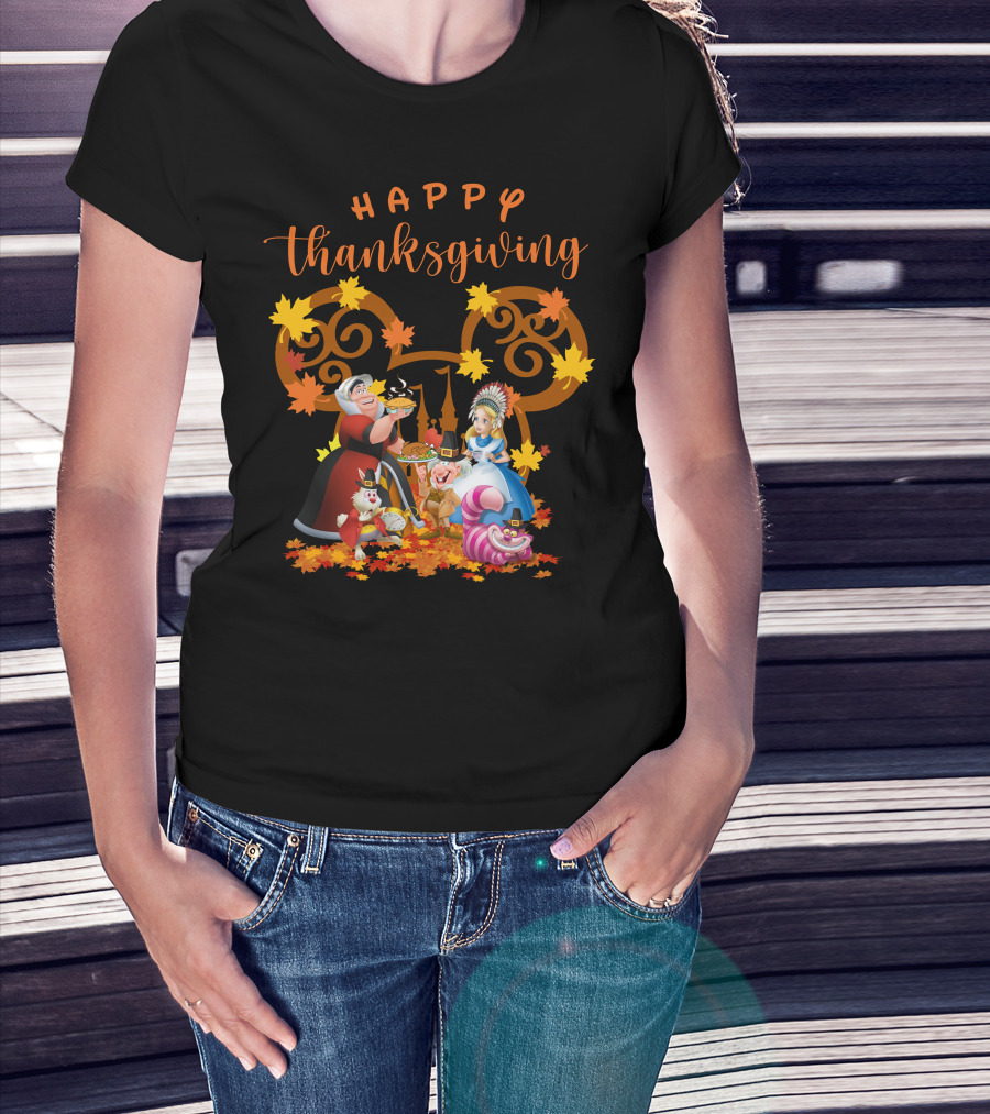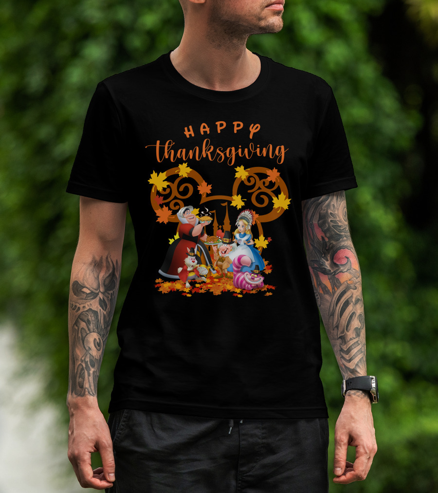 Happy Thanksgiving Alice Queen Mad Hatter Cheshire Cat Leaves T-Shirt