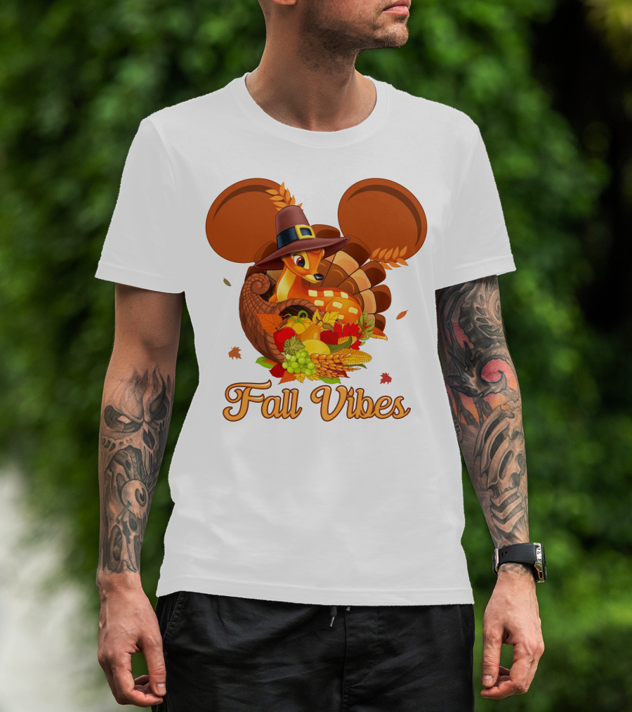 The Fall Vibes Bambi Thanksgiving Mouse Ears Cornucopia T-shirt is designed for everyday wear and a consistent fit. Fabric is pre-shrunk ring-spun cotton with durable stitching. See the size chart below for exact measurements.