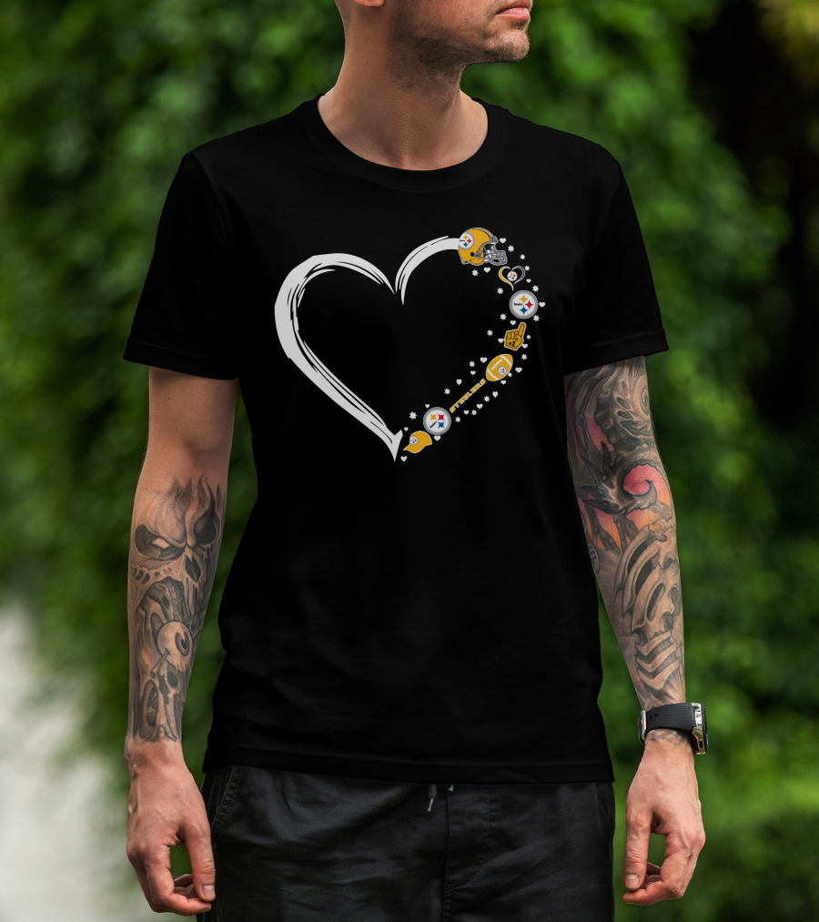 The Pittsburgh Steelers Heart Helmet Foam Finger Stars Fan Art #1 Fan T-shirt is designed for everyday wear and a consistent fit. Fabric is pre-shrunk ring-spun cotton with durable stitching. See the size chart below for exact measurements.
