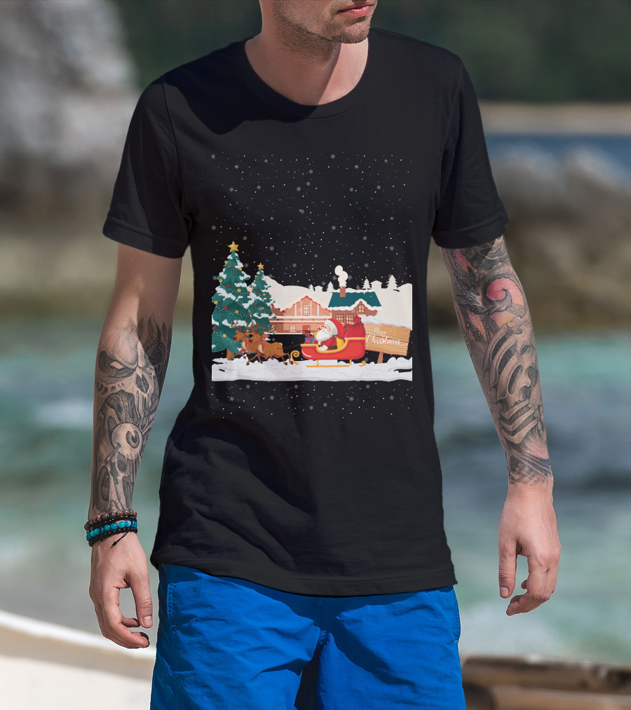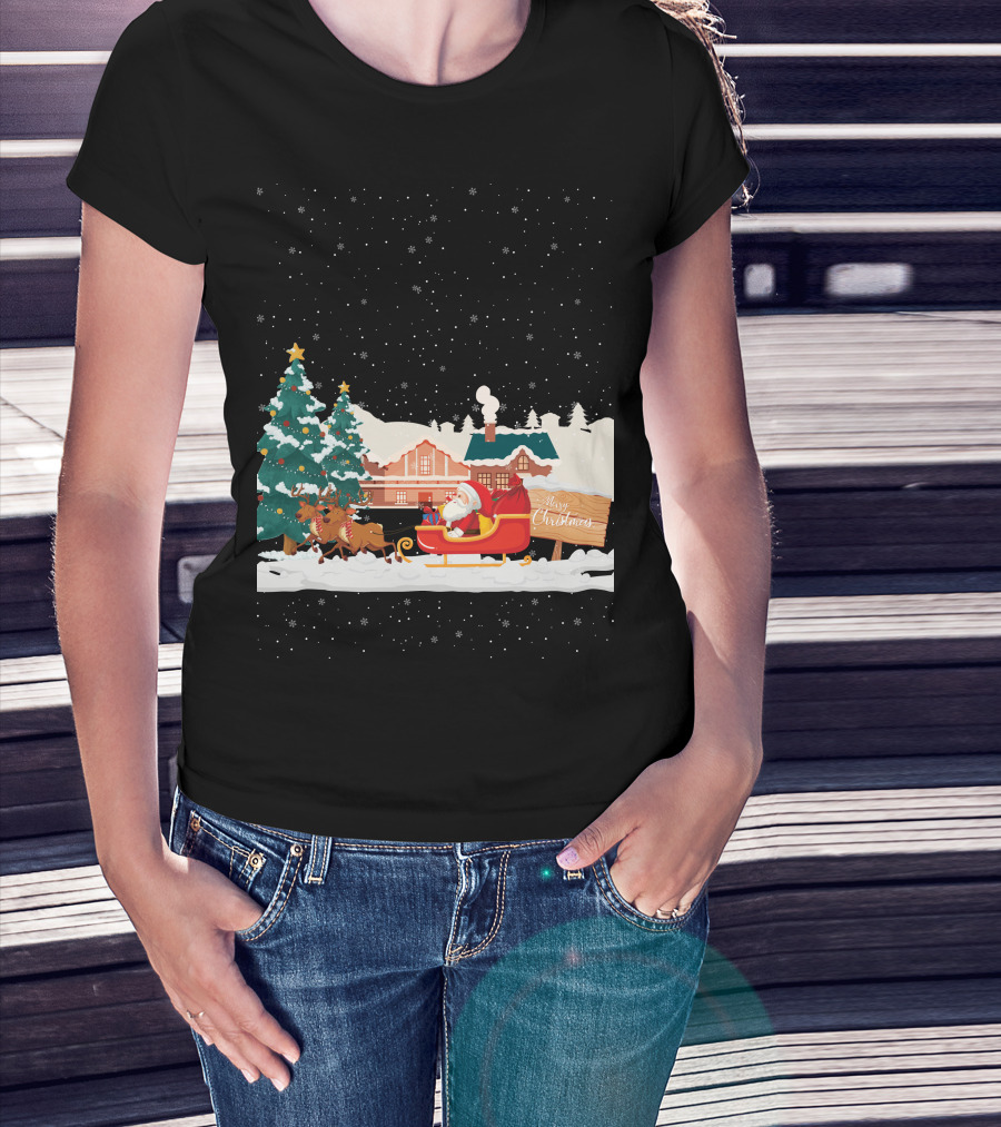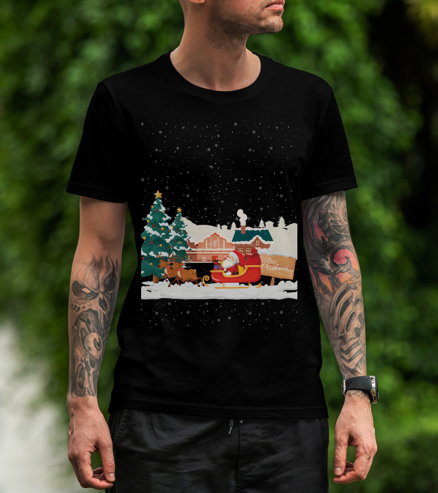 Merry Christmas Santa Claus Reindeer Sleigh Winter Scene T-Shirt