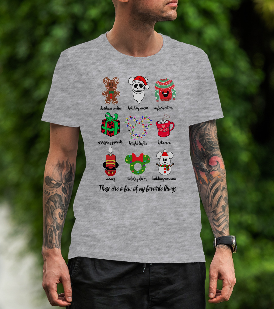 The Christmas Cookies Holiday Movies Ugly Sweaters Wrapping Presents Bright Lights Hot Cocoa Mmmq Holiday Decor Building Snowman These Are a Few of My Favorite Things T-shirt is designed for everyday wear and a consistent fit. Fabric is pre-shrunk ring-spun cotton with durable stitching. See the size chart below for exact measurements.