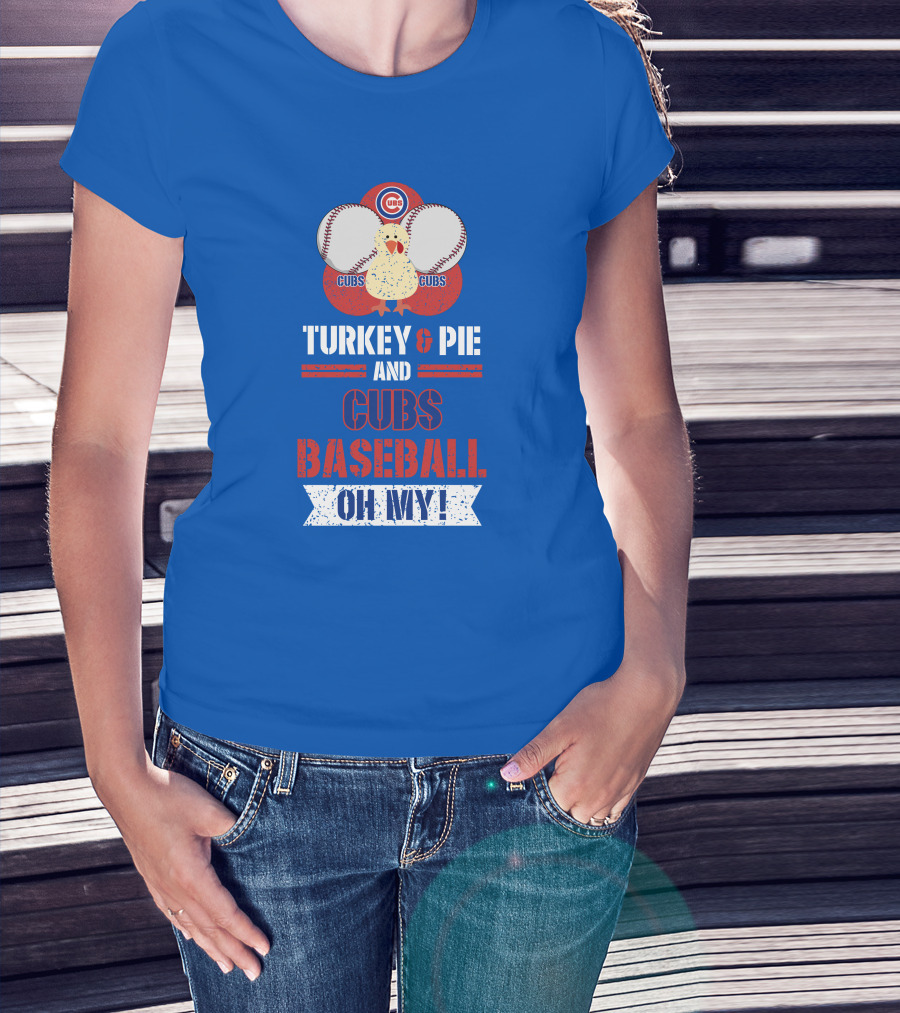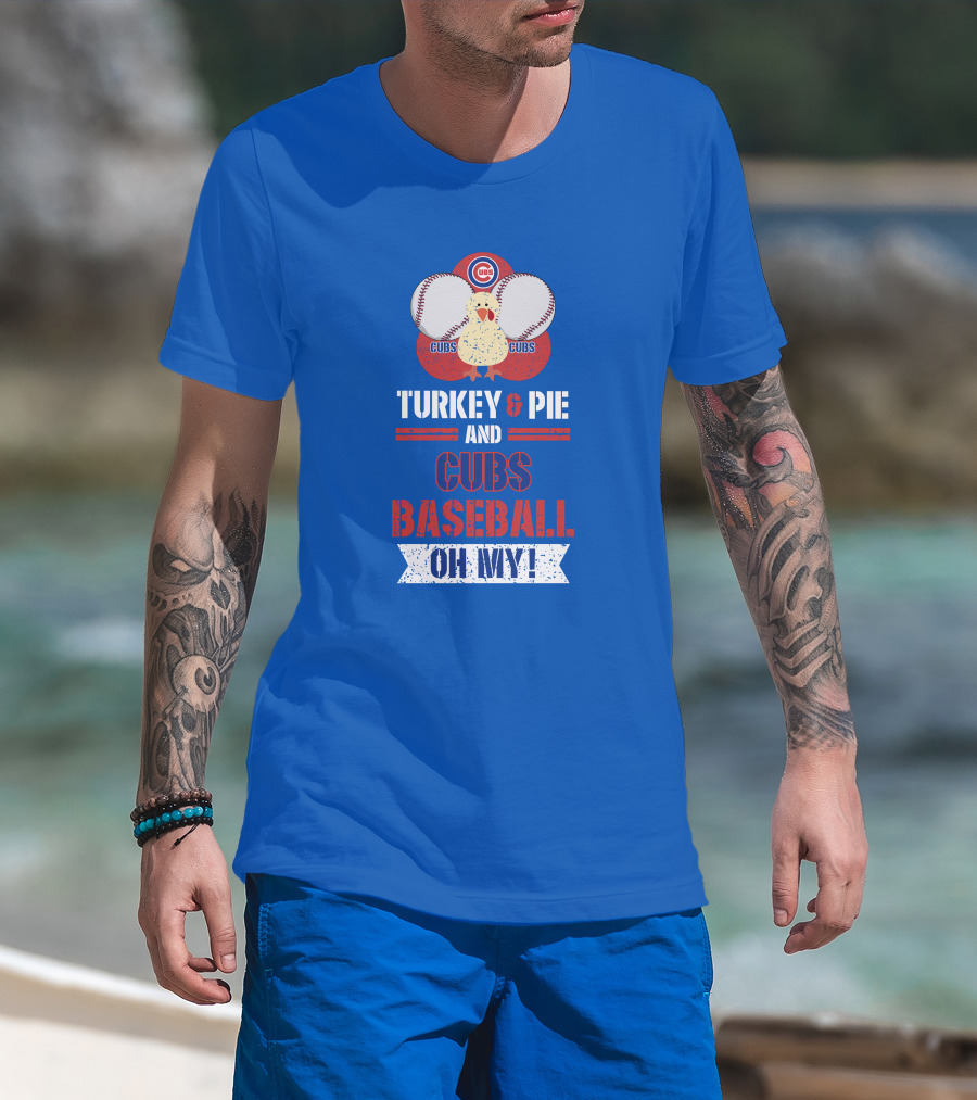 The Turkey and Pie and Cubs Baseball Oh My T-shirt is designed for everyday wear and a consistent fit. Fabric is pre-shrunk ring-spun cotton with durable stitching. See the size chart below for exact measurements.