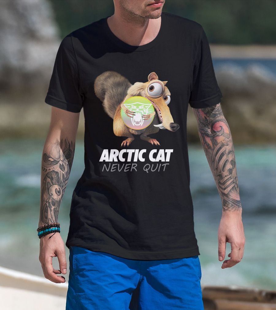 ARCTIC CAT NEVER QUIT Cartoon Character Holding T-Shirt