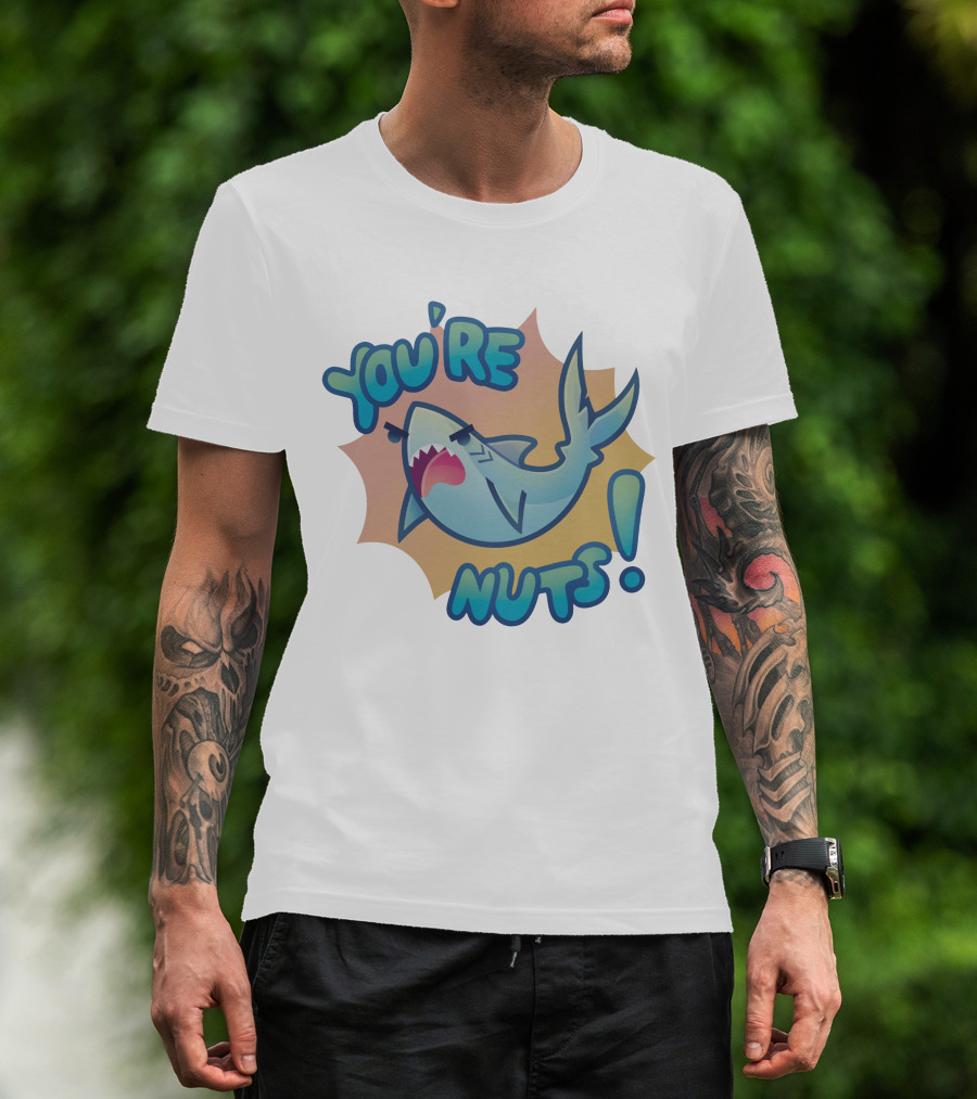 The You're Nuts Shark Cartoon T-shirt is designed for everyday wear and a consistent fit. Fabric is pre-shrunk ring-spun cotton with durable stitching. See the size chart below for exact measurements.