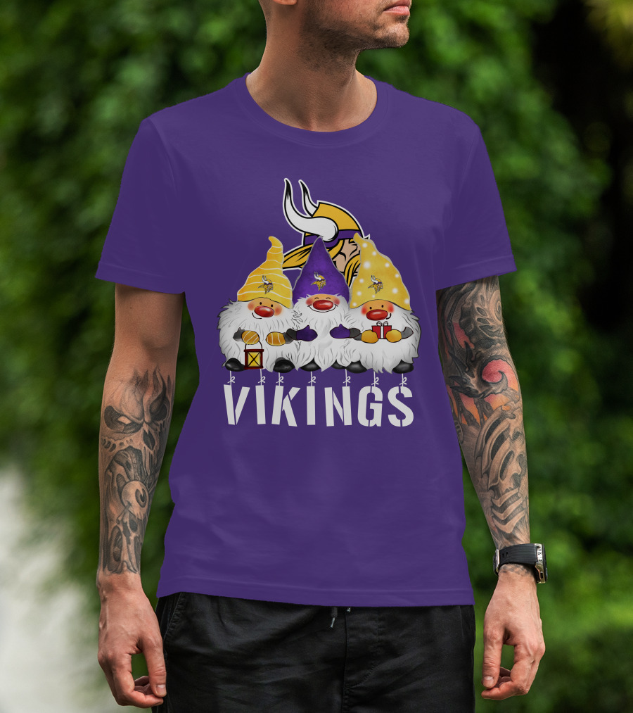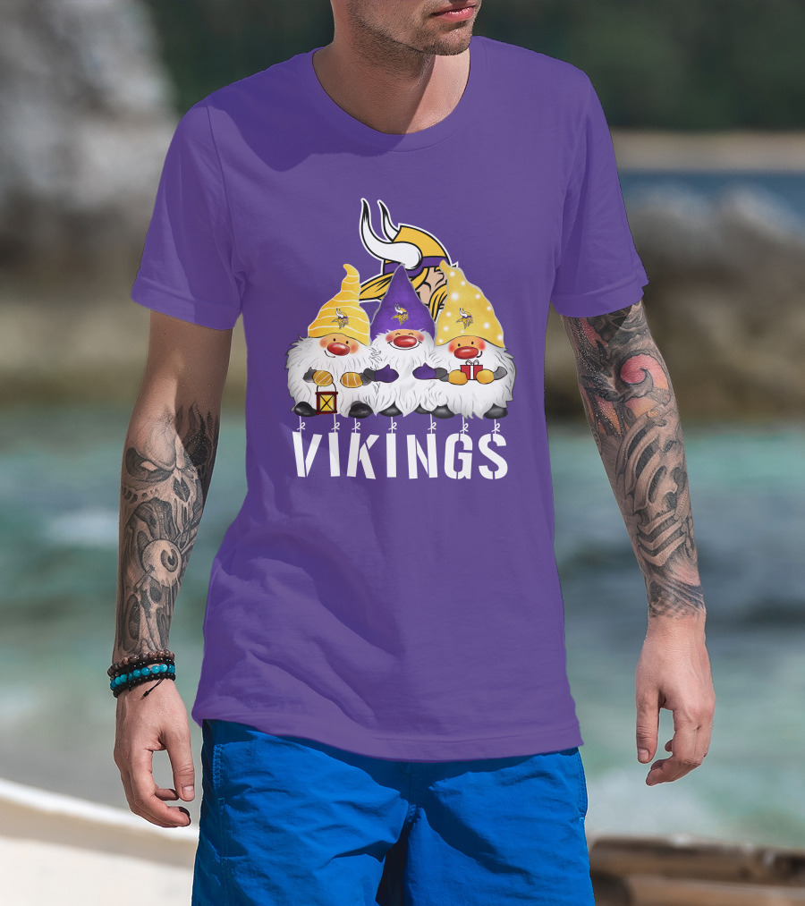 The Minnesota Vikings Merry Christmas Happy Holidays Gnomes T-shirt is designed for everyday wear and a consistent fit. Fabric is pre-shrunk ring-spun cotton with durable stitching. See the size chart below for exact measurements.