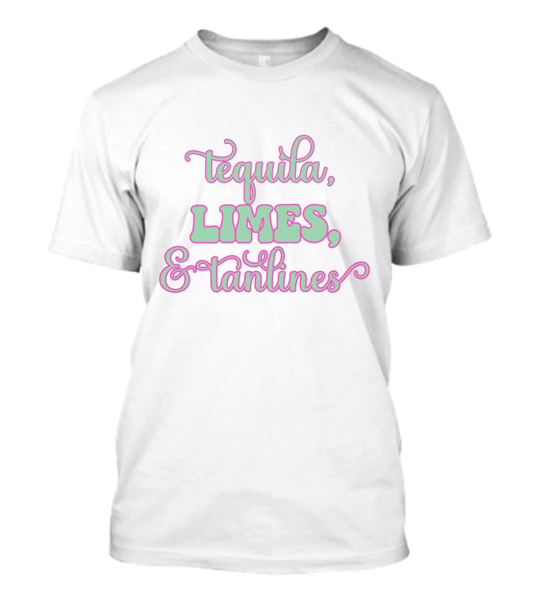 The Tequila, Limes, and Tanlines T-shirt is designed for everyday wear and a consistent fit. Fabric is pre-shrunk ring-spun cotton with durable stitching. See the size chart below for exact measurements.