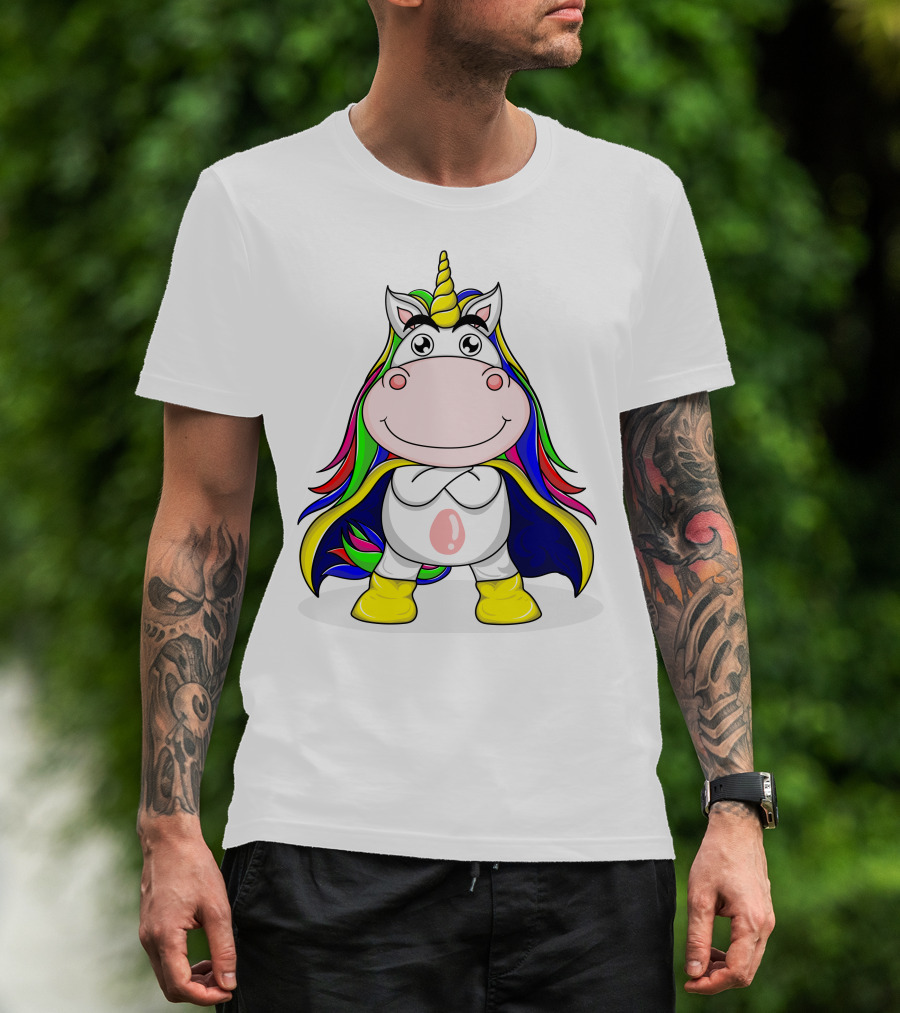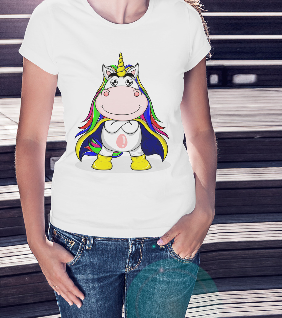 The Superhero Unicorn with Rainbow Cape and Yellow Boots T-shirt is designed for everyday wear and a consistent fit. Fabric is pre-shrunk ring-spun cotton with durable stitching. See the size chart below for exact measurements.