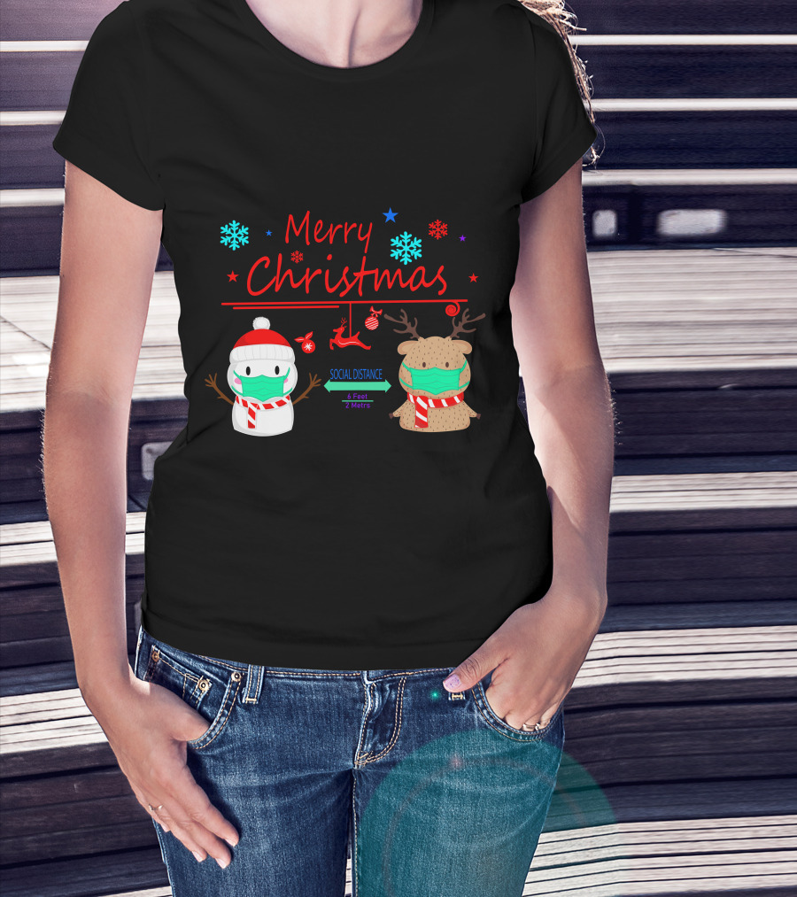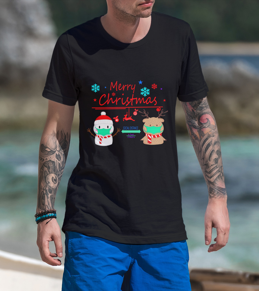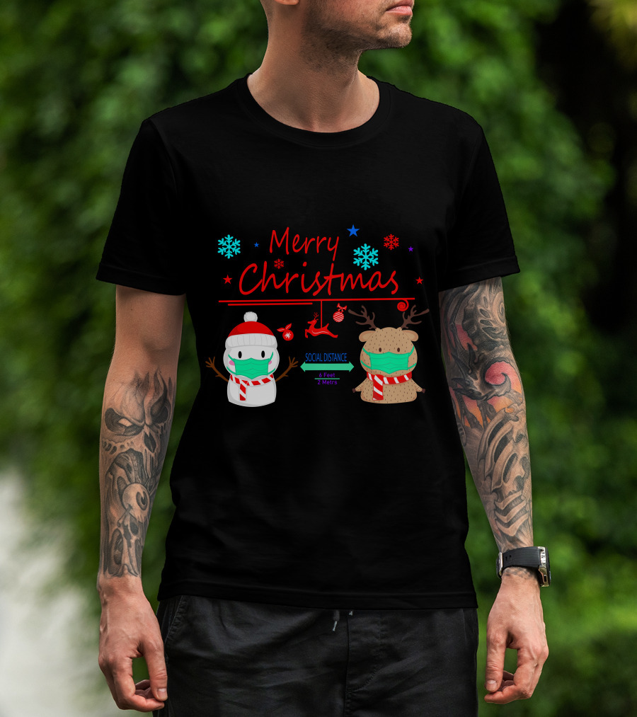 Merry Christmas Social Distance Snowman And Reindeer With Masks T-Shirt