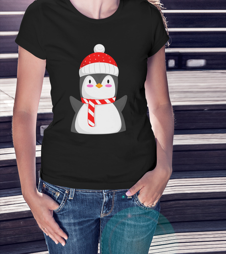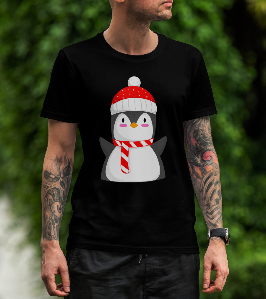 Pinguine Christmas Winter Penguin With Red Snowy Hat And Striped Scarf T-Shirt