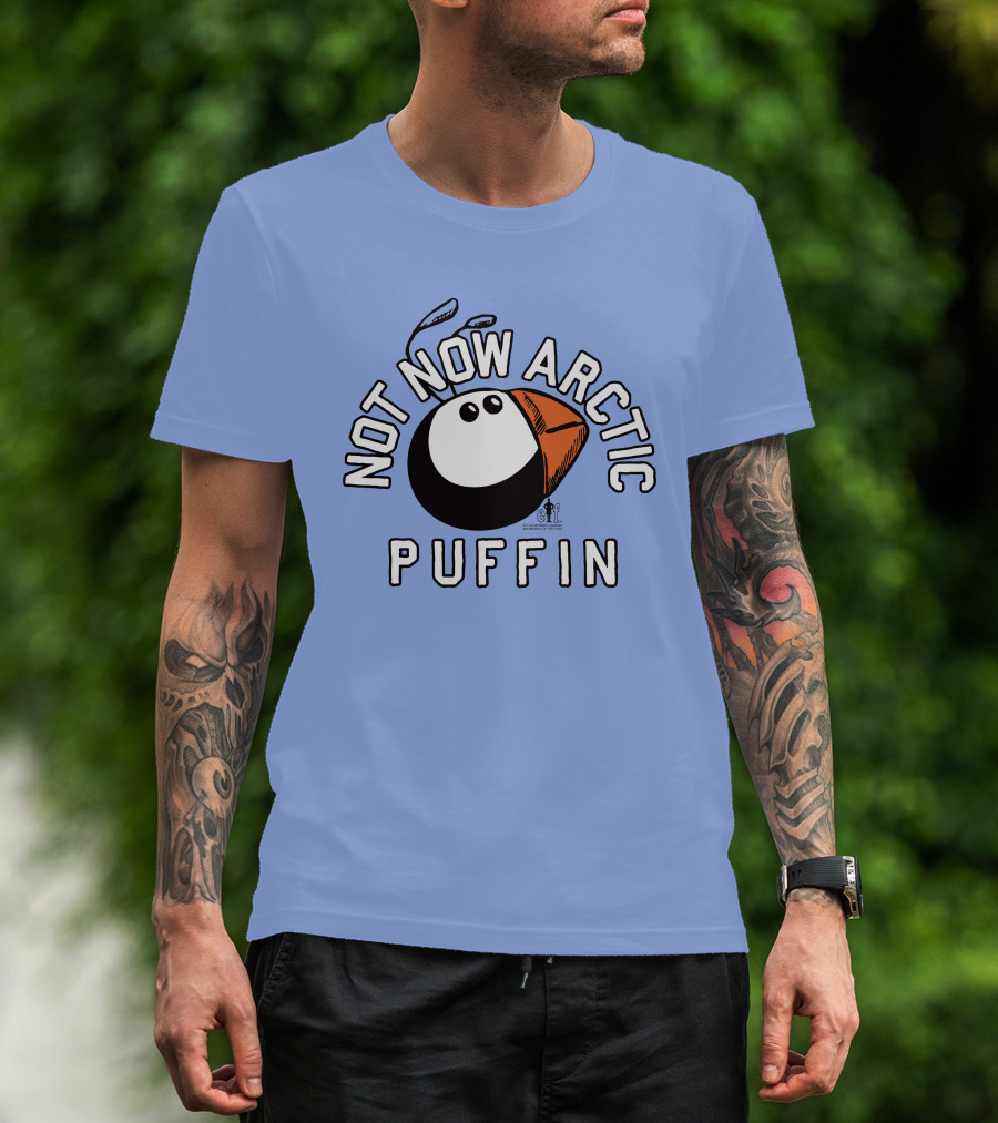 The Not Now Arctic Puffin Mood Just Mike T-shirt is designed for everyday wear and a consistent fit. Fabric is pre-shrunk ring-spun cotton with durable stitching. See the size chart below for exact measurements.