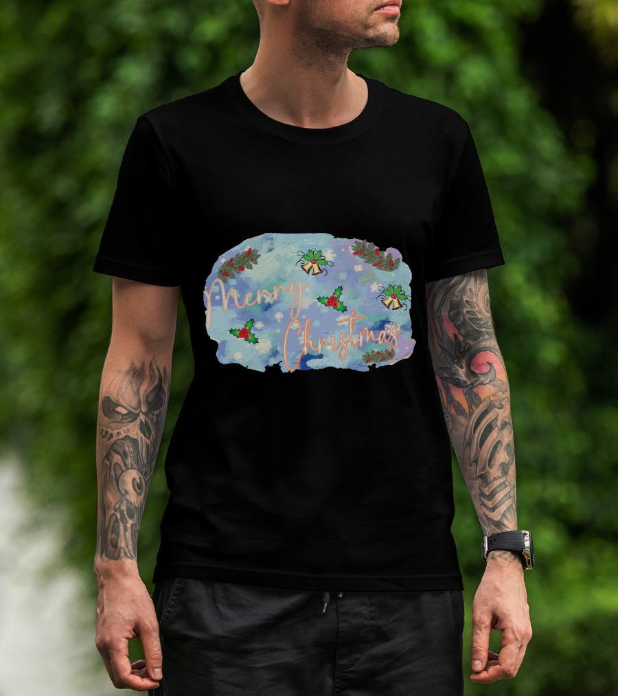 The Merry Christmas Watercolor Holly and Bells T-shirt is designed for everyday wear and a consistent fit. Fabric is pre-shrunk ring-spun cotton with durable stitching. See the size chart below for exact measurements.