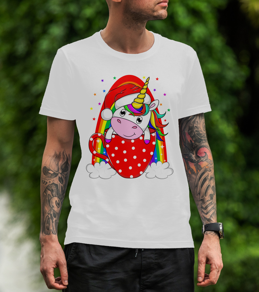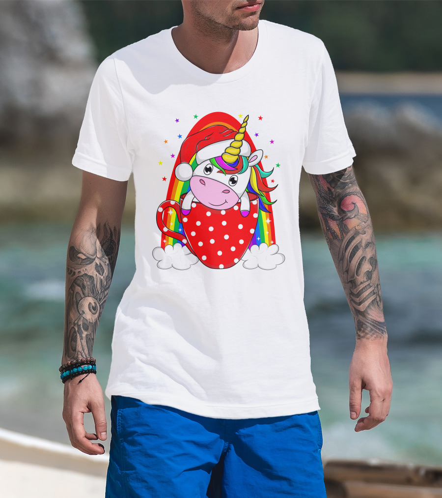 The Unicorn in Santa Hat with Rainbow and Red Polka Dot Cup T-shirt is designed for everyday wear and a consistent fit. Fabric is pre-shrunk ring-spun cotton with durable stitching. See the size chart below for exact measurements.