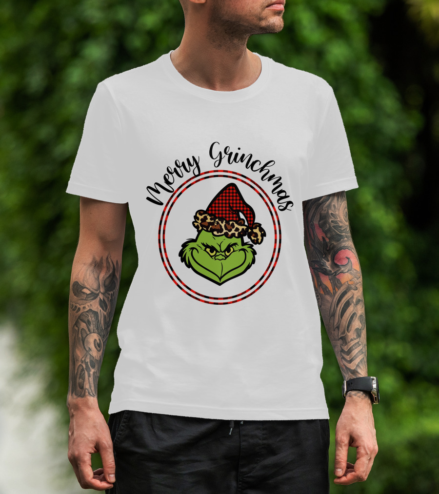 Merry Grinchmas Plaid Santa Hat Grinch Face T-Shirt