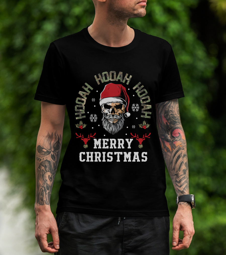 Hooah Hooah Hooah Merry Christmas Skull Santa Hat Reindeer T-Shirt