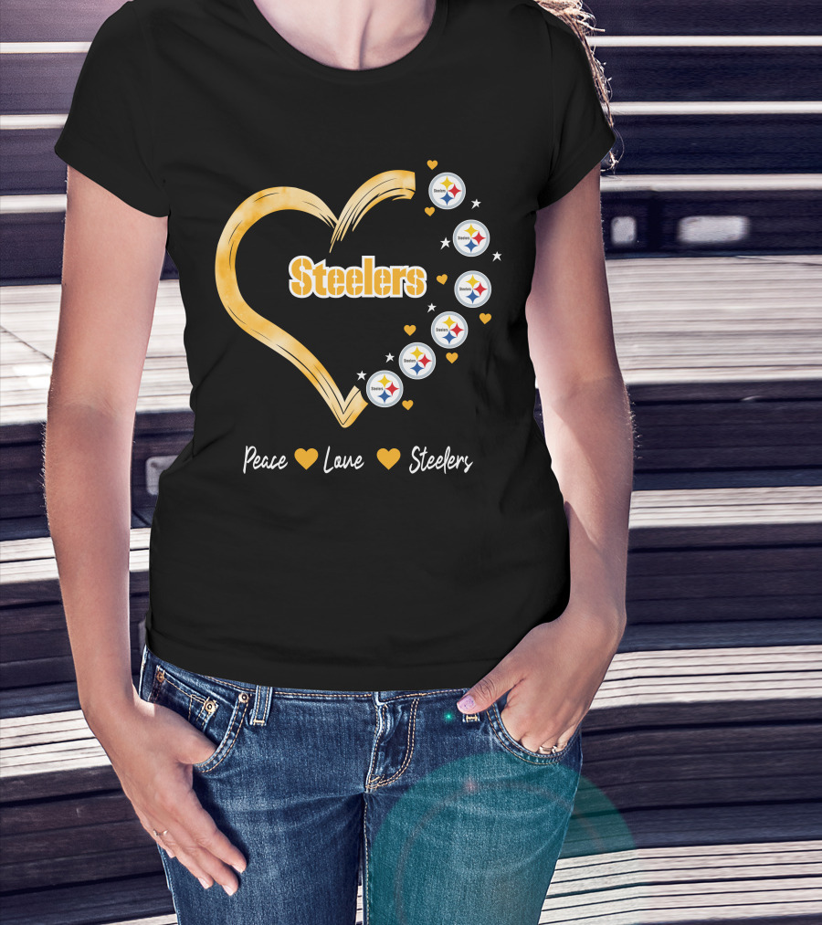 The Peace Love Steelers Heart Filled with Pittsburgh Steelers Logos and Stars T-shirt is designed for everyday wear and a consistent fit. Fabric is pre-shrunk ring-spun cotton with durable stitching. See the size chart below for exact measurements.